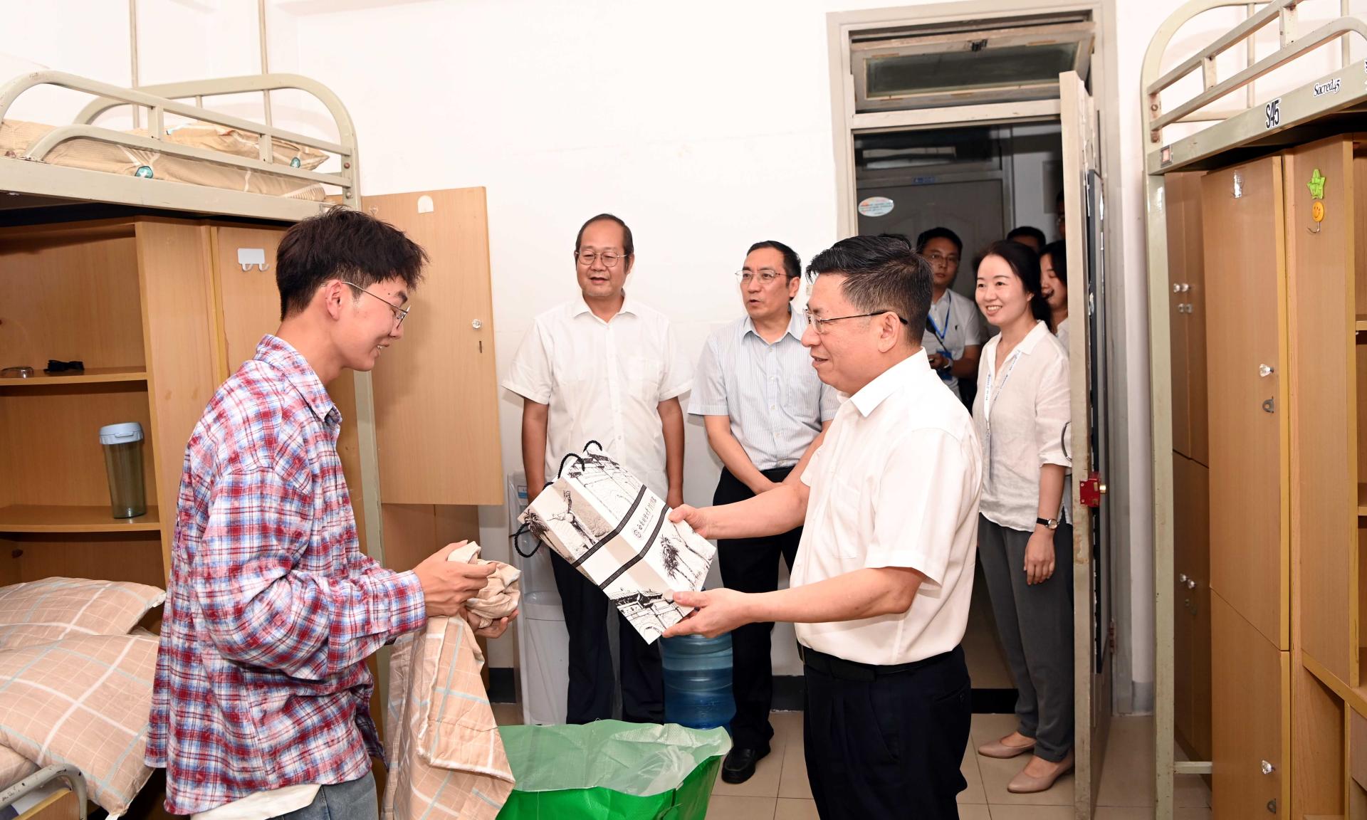 趙德武來到宿舍看望已入住新生,詳細詢問注冊報到情況,就學業學習、校園環境、生活便利情況等與新生和家長親切交流,勉勵2023級新生樹立目標、夯實基礎,努力成長為堪當民族復興重任的時代新人,并向新生送上入學大禮包。