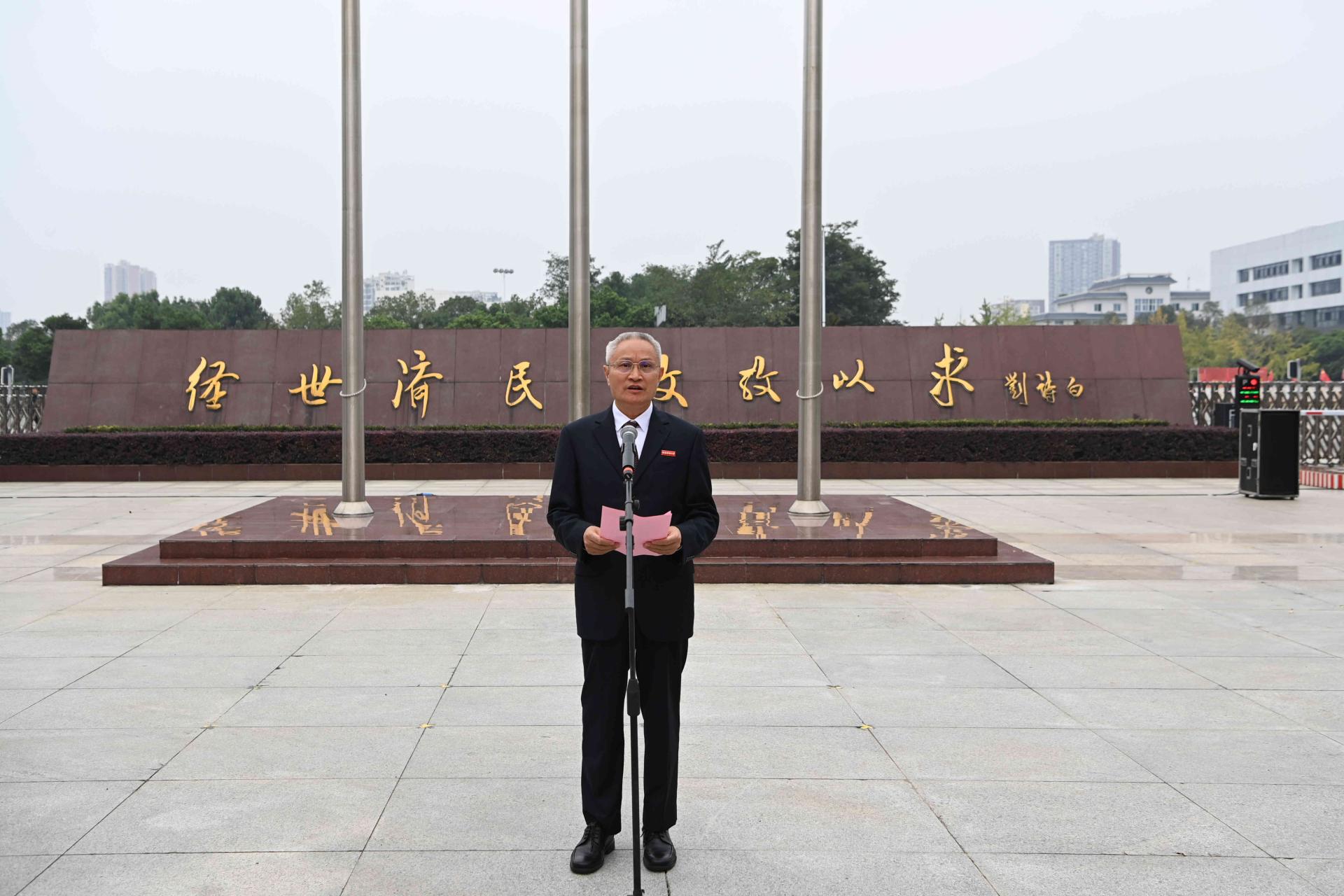 升國旗儀式上,曾道榮、歐兵分別發表熱情洋溢的講話,向新中國72歲華誕致以深情祝福,向為民族獨立、人民幸福建立不朽功勛的革命先烈表示深切懷念,向全校師生員工致以節日的祝賀。他們深入回顧了新中國成立72年來中國共產黨團結帶領全國各族人民取得的舉世矚目的偉大成就,深情祝愿偉大祖國繁榮富強、人民幸福安康。他們指出,愛國在心,強國在志,報國在行。愛國之心,是再樸素不過的情感;強國之志,是再應該不過的抱負;報國之行,是再自然不過的選擇。他們希望,同學們要立大志、明大德、成大才、擔大任,自覺用習近平新時代中國特色社會主義思想武裝頭腦,深刻認識中國共產黨為什么能、馬克思主義為什么行、中國特色社會主義為什么好,自覺增強“請黨放心、強國有我”的使命擔當,將愛黨、愛國、愛社會主義的深厚情感落實到奮斗實踐中,爭做有志氣有骨氣有底氣的時代新人,以青春之我創造青春之國家、青春之民族,讓青春之花在為祖國、為民族、為人民、為人類的不懈奮斗中絢麗綻放。