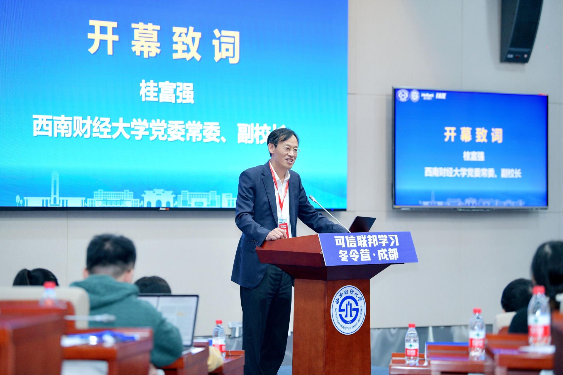 11月10日-12日,由西南財(cái)經(jīng)大學(xué)、FATE開(kāi)源社區(qū)、微眾銀行、中國(guó)計(jì)算機(jī)學(xué)會(huì)主辦,“數(shù)字經(jīng)濟(jì)與交叉科學(xué)創(chuàng)新研究院”財(cái)經(jīng)科技集成創(chuàng)新平臺(tái)(園區(qū))、西南財(cái)經(jīng)大學(xué)計(jì)算機(jī)與人工智能學(xué)院、新財(cái)經(jīng)綜合實(shí)驗(yàn)室和中國(guó)計(jì)算機(jī)學(xué)會(huì)成都分部共同承辦的“可信聯(lián)邦學(xué)習(xí)冬令營(yíng)”在我校正式開(kāi)營(yíng)。冬令營(yíng)吸引了來(lái)自香港科技大學(xué)、清華大學(xué)、浙江大學(xué)、中國(guó)科學(xué)院大學(xué)、復(fù)旦大學(xué)、華中科技大學(xué)、四川大學(xué)以及我校等十余所高校及微眾銀行、京東、中國(guó)聯(lián)通等知名企業(yè)80余位可信聯(lián)邦學(xué)習(xí)研究領(lǐng)域的專家導(dǎo)師和優(yōu)秀本碩博學(xué)生積極參與,進(jìn)一步推動(dòng)了我校“產(chǎn)、學(xué)、研、用”跨領(lǐng)域合作與交流。學(xué)校黨委常委、副校長(zhǎng)桂富強(qiáng)在開(kāi)幕式上致辭。